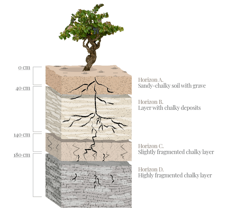 The second is found at a depth of 40-140cm and is formed by chalky rock that is more or less fragmented depending on the part of Terrerazo in which it is located – more fragmented in the central area of Terrerazo and less fragmented in its higher areas. This horizon is the heart of our terroir, where the roots meet the chalk.